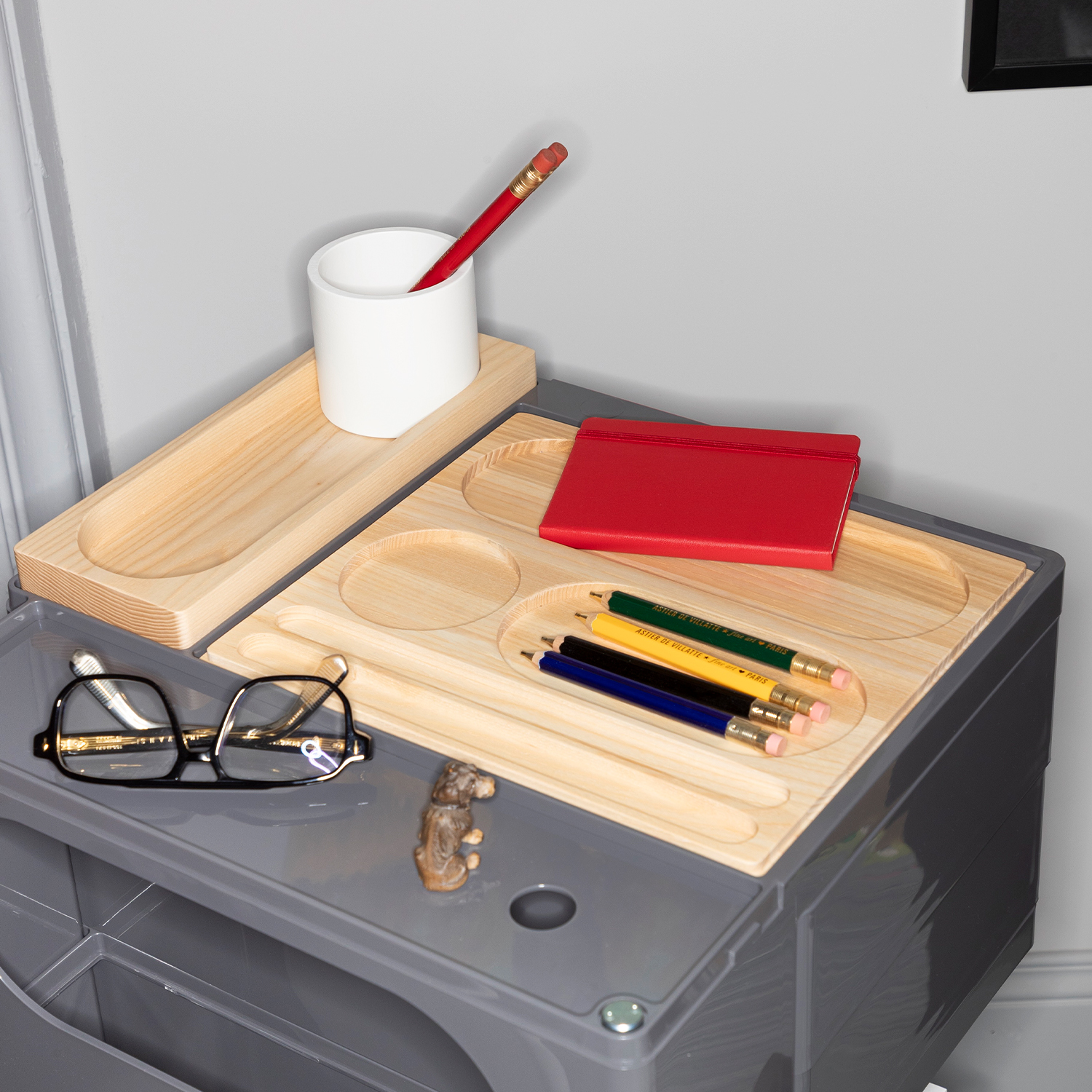 Fill è un portaoggetti versatile e componibile, pensato per adattarsi a diversi ambienti. Il set si compone di due elementida appoggio in legno massello naturale con vani portaoggetti sagomati all’interno, e di un cilindro contenitore di colore contrastante. Espressione inequivocabile del design modulare, questo sistema si trasforma scomponendosi e riconfigurandosi come un puzzle, a seconda dell’utilizzo e della collocazione. La versatilità di Fill lo rende l’estensione perfetta per diversi sistemi e complementi d’arredo a catalogo, ottimizzando la gestione dello spazio e permettendo di organizzare e suddividere in modo pratico i piccoli oggetti di uso quotidiano.